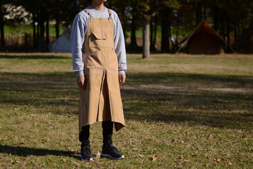 難燃生地で焚き火周りでも安心して使用できます。ポケットや金具を機能的に配置しました。