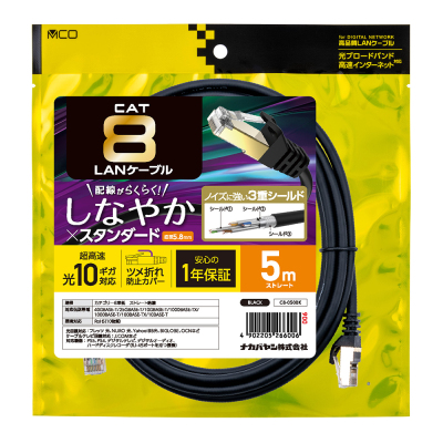 ●対応規格:カテゴリー8(40GBASE-T、25GBASE-T) ●ケーブル仕様:STP、AWG30(4ペア)、ストレート結線、ヨリ導体 ●プラグ仕様:RJ45スリムコネクタ / 金メッキシールドプラグ ●ケーブル径:直径約5.8mm
