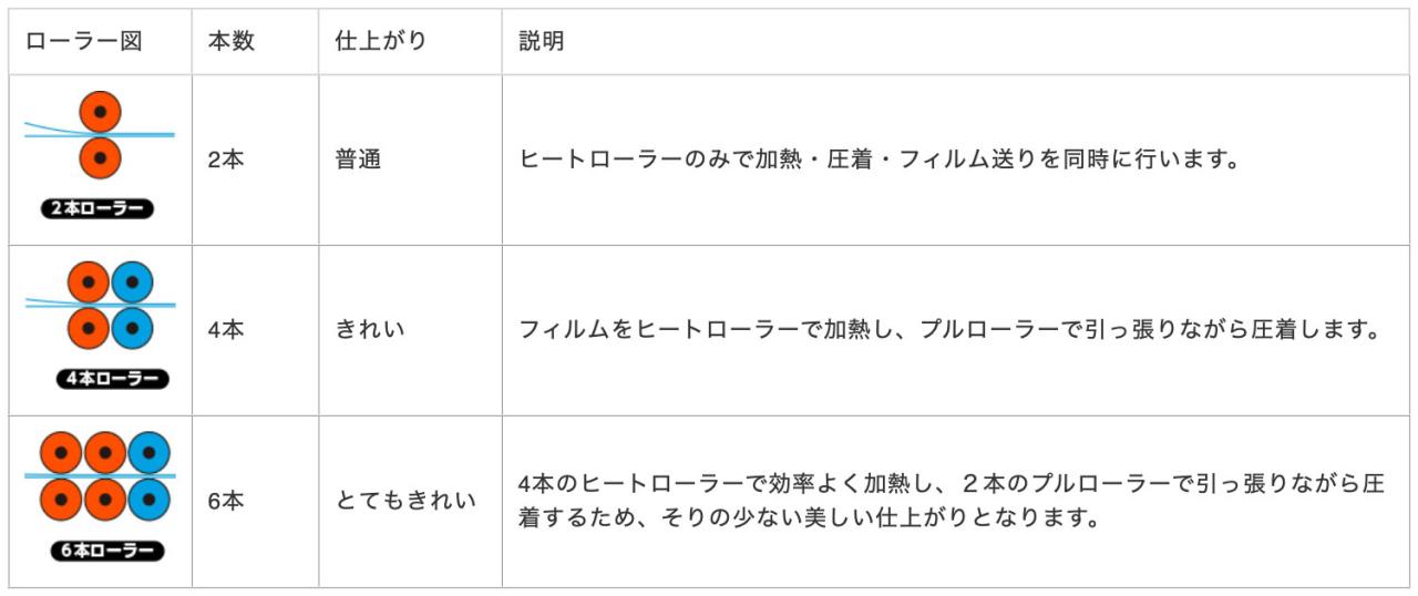 加熱ローラー2本が基本となり+圧着ローラーが増えます。